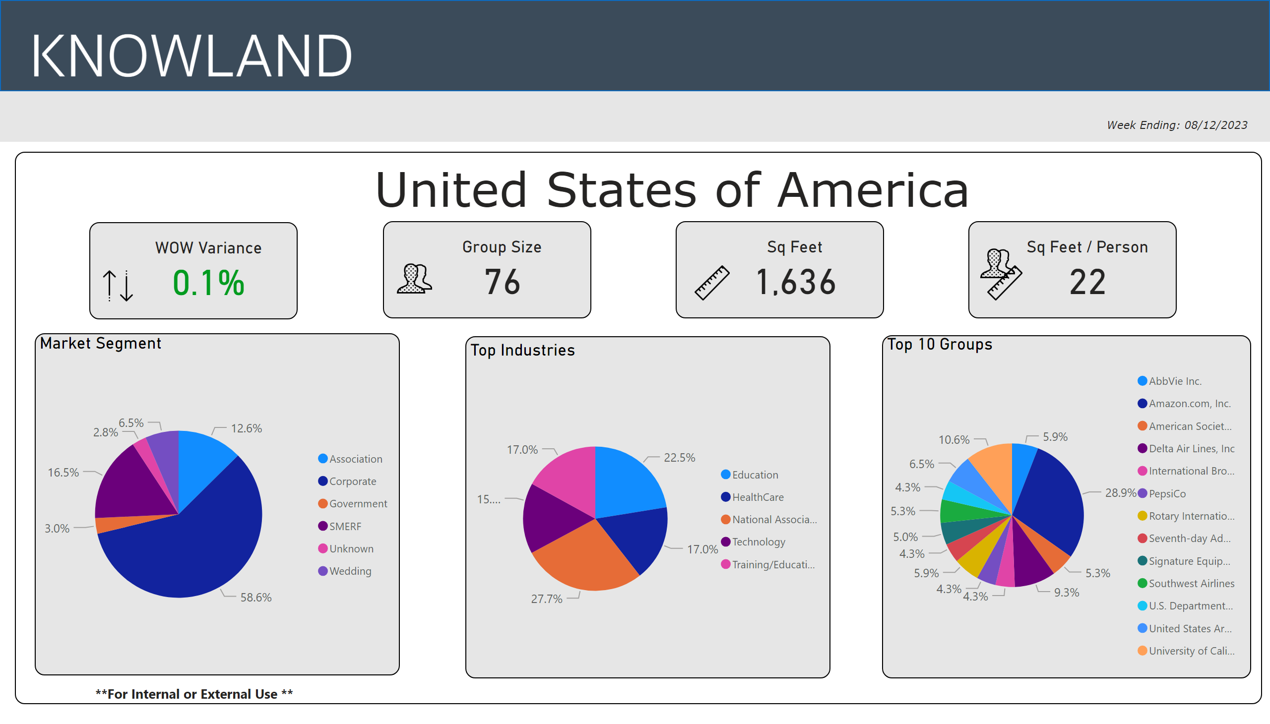 For the week ending August 12, 2023, the number of U.S. meetings and events was flat with .1% increase compared to the prior week. Corporate events continue to dominate share volume with 58.6% of meetings and events, with National Associations driving the dominant industry share at 27.7% for the week, followed by the Education segment at 22.5%, for the top five segments.